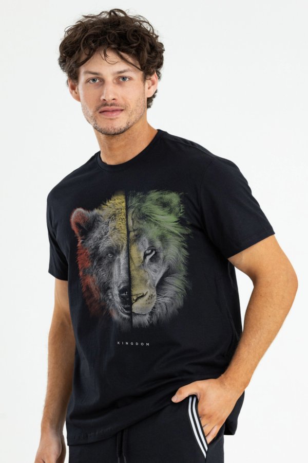 Nossa camiseta masculina manga curta Kingdom feita em malha 100% algodão na cor preta traz essa estampa frontal mesclando o semblante do nosso URSO com as cores Amarelo, vermelho com o semblante do Leão nas cores Amarelo e verde, além de detalhes em branco, preto e cinza. A perfeita fusão de cores destacando no peito a Força de um URSO e a Bravura de um Leão.